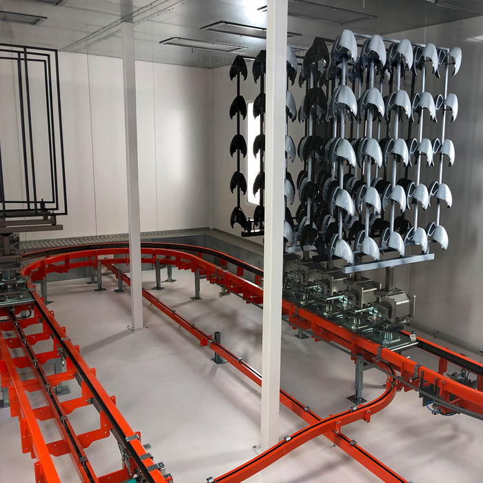 Subject: Surface treatment line with CALDAN floor conveyor End user: MAGNA SLOVTECA s.r.o. Installation site location: Slovakia Type of parts to be handled: Car mirrors Dimensions of parts (l x w x h): max. 1.200 x 300 x 1.700 mm Weight of parts: max. 50 kg per wagon (product, jig & fixture) Cycle time: 100 seconds Conveyor speed “all-over”: approx. 4 – 5 m/min. Conveyor speed “Power Wash”: approx. 1.5 – 2.5 m/min. Conveyor speed “Booths/cabins”: approx. 0.8 – 1.6 m/min. Loading and unloading of the parts: Manually, in a stop-position Rotation type: – mechanical turning, chain continuously running Surrounding temperatures: Drying oven max. 80 °C