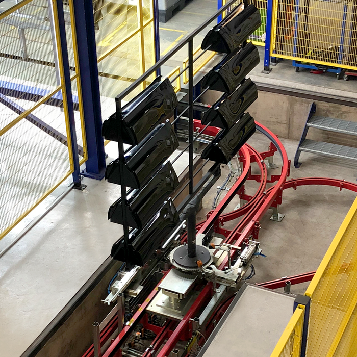 Le pas de chaîne de transport est défini en fonction de vos spécifications. Chaque ensemble de chariot et de balancelle peut être séparé du pas de chaîne et accumulé en ligne. L’accumulation est effectuée en abaissant le pas de chaîne au départ de la zone d’accumulation. Le convoyage de charges dans les sections de monte et baisse est possible grâce à son concept de fixation unique entre les transporteurs de la chaîne et le chariot.
