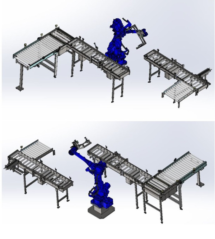 Il est composé d’un robot à 6 axes équipé d’un préhenseur, ainsi que de convoyeurs à rouleaux motorisés.